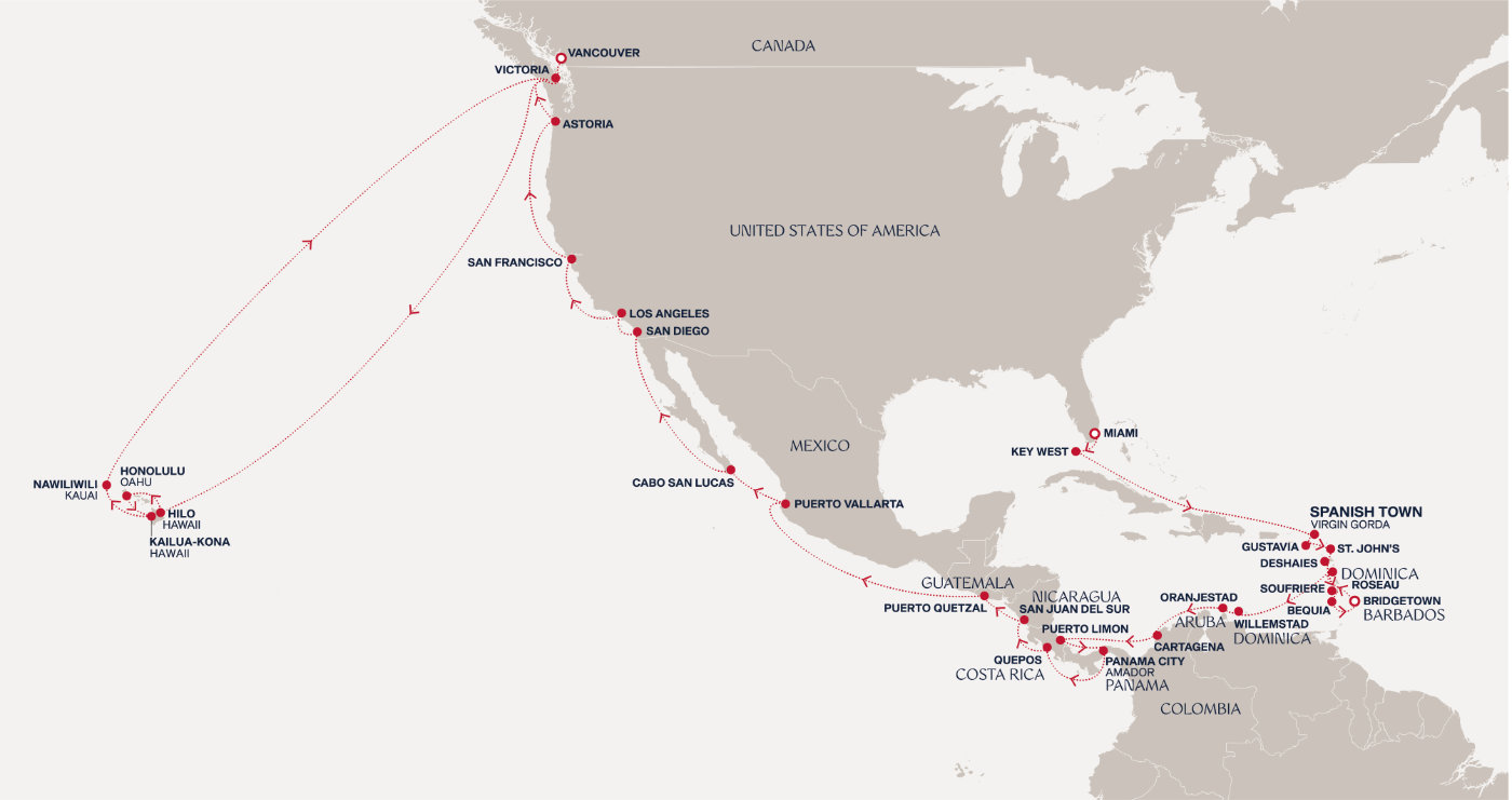 Wir ziehen den Hut vor den Experten, die diese Route komponiert haben. Sie schiffen in Miami ein und genießen zuerst zwei Wochen lang die Karibik, wie sie im Buche steht. Mit den Britischen Jungferninseln, Antigua & Barbuda, Guadeloupe, Saint Lucia, Barbados, Dominica, Curaçao und Aruba. Mit Seetagen, an denen Sie den puren Luxus an Bord auskosten. Mit besonders langen Inselbesuchen bis spätabends, die Ihr Erlebnis intensiver machen, mit Sonne satt und wohltuender Wärme. Dann erwartet Sie Mittelamerika mit Aufenthalten in Kolumbien, Costa Rica, Panama, Nicaragua, Guatemala und Mexiko. Im nächsten Abschnitt reisen Sie die Westküste der USA hinauf mit Stopps in San Diego, Los Angeles und San Francisco, und bevor Ihre Reise im kanadischen Vancouver endet, entdecken Sie sechs Tage lang die inspirierende hawaiianischen Inselwelt.