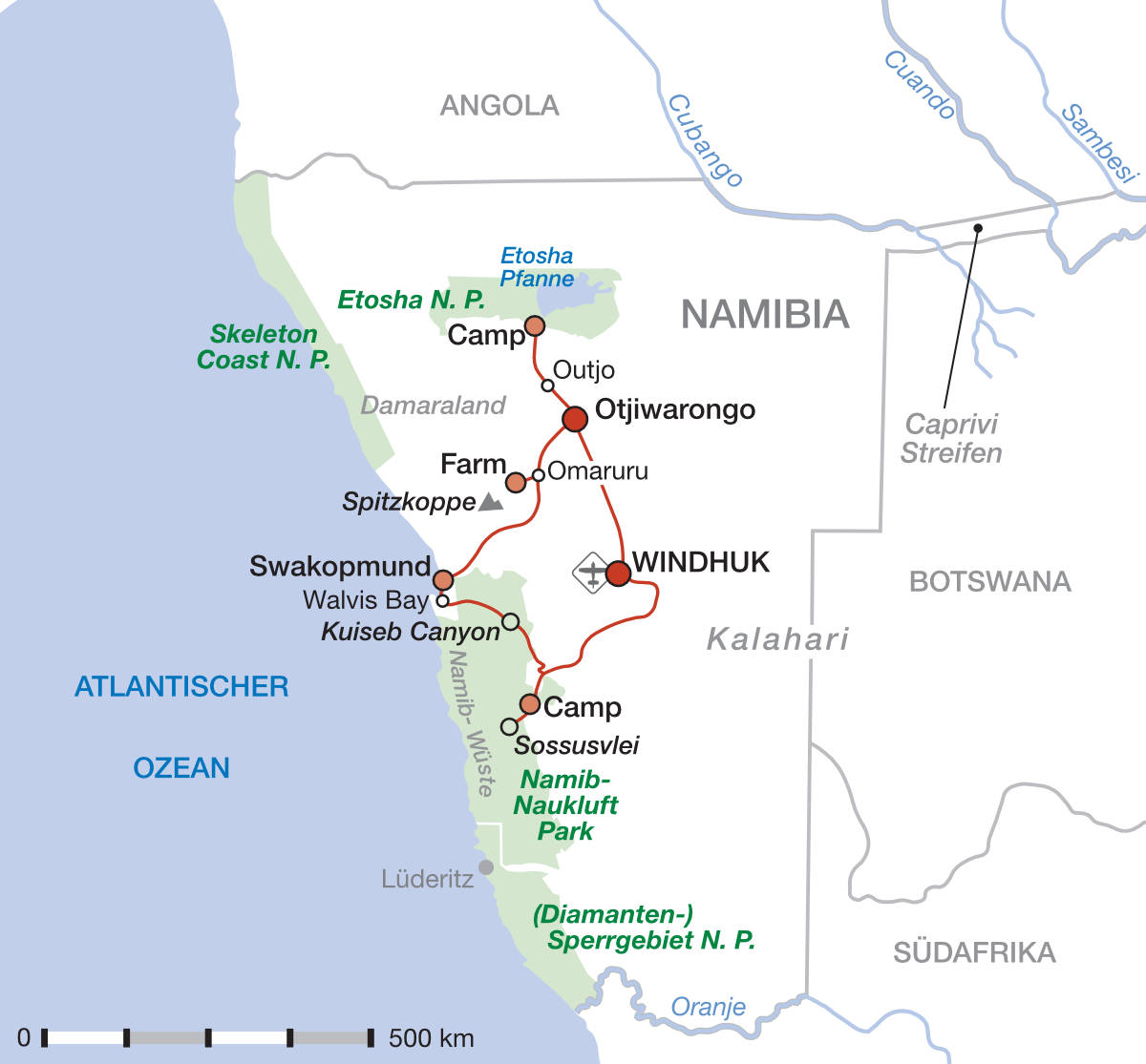 Ihre deutschsprachige Reiseleitung bringt Ihnen Land, Leute und Natur mit viel Wissen und Begeisterung näher. Die Reisetage sind ausgewogen gestaltet: mit spannenden Höhepunkten wie Pirschfahrten im Etosha-Nationalpark, einem Besuch im faszinierenden Dead Vlei oder einer Sundowner-Tour durch die Erongo-Berge und zugleich mit genügend Zeit zum Entspannen, Erleben und Genießen.