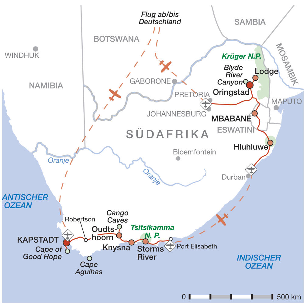 - Flug (Economy) nach Johannesburg (JNB) und zurück von Kapstadt (CPT), nach Verfügbarkeit. Ggf. zzgl. Flugzuschlag.