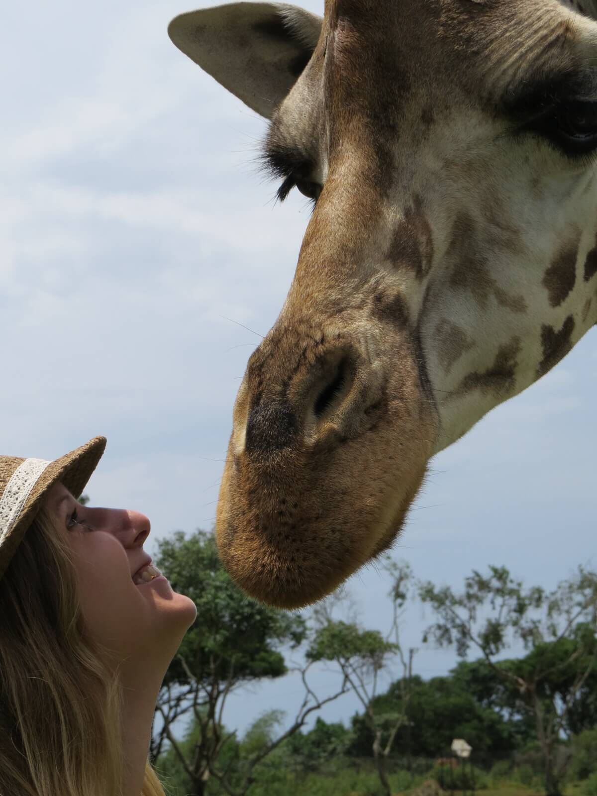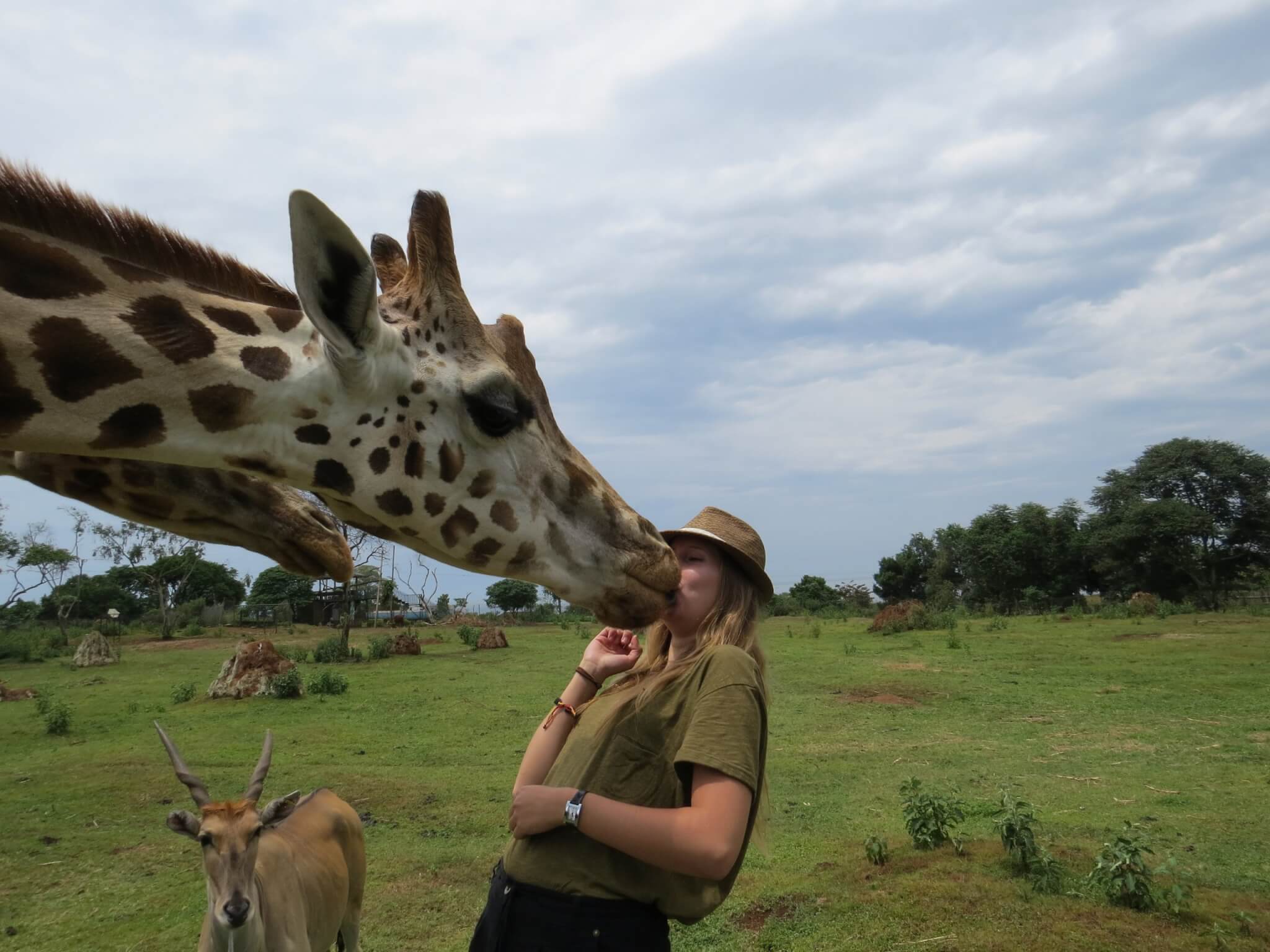 Ich war 2015 in Uganda im „Uganda Wildlife Conservation Center“, eine Rehabilitationszentrum für Tiere. Dort haben meine Freundin Carol und ich einen Blick hinter die Kulissen werfen dürfen. Als wir bei den Giraffen ankamen, sahen wir bereits vom Weitem die prächtige, riesige Giraffe Albert. Als wir dort auf der Ladefläche des Autos saßen und die Antilopen und Giraffen in dem Gehege beobachteten, frage der Tierpfleger mich grinsend ob ich eine Banane essen möchte. Ich genoß meine Banane, als Albert kam und mir die Banane klaute. Das war ein wirklich ein Kuss der besonderen Art.